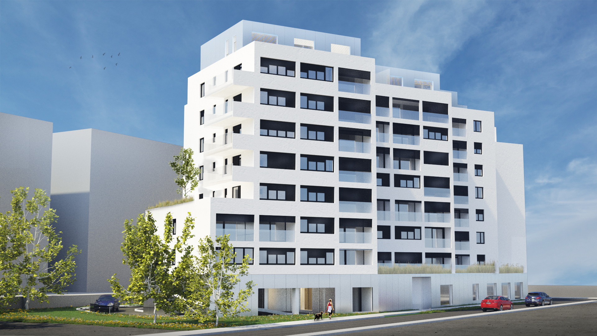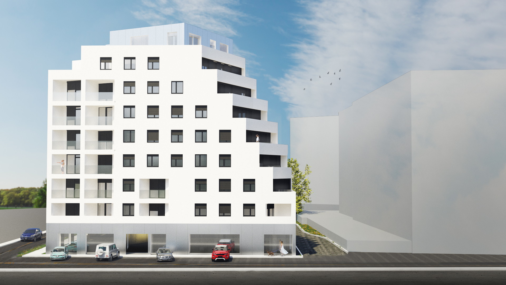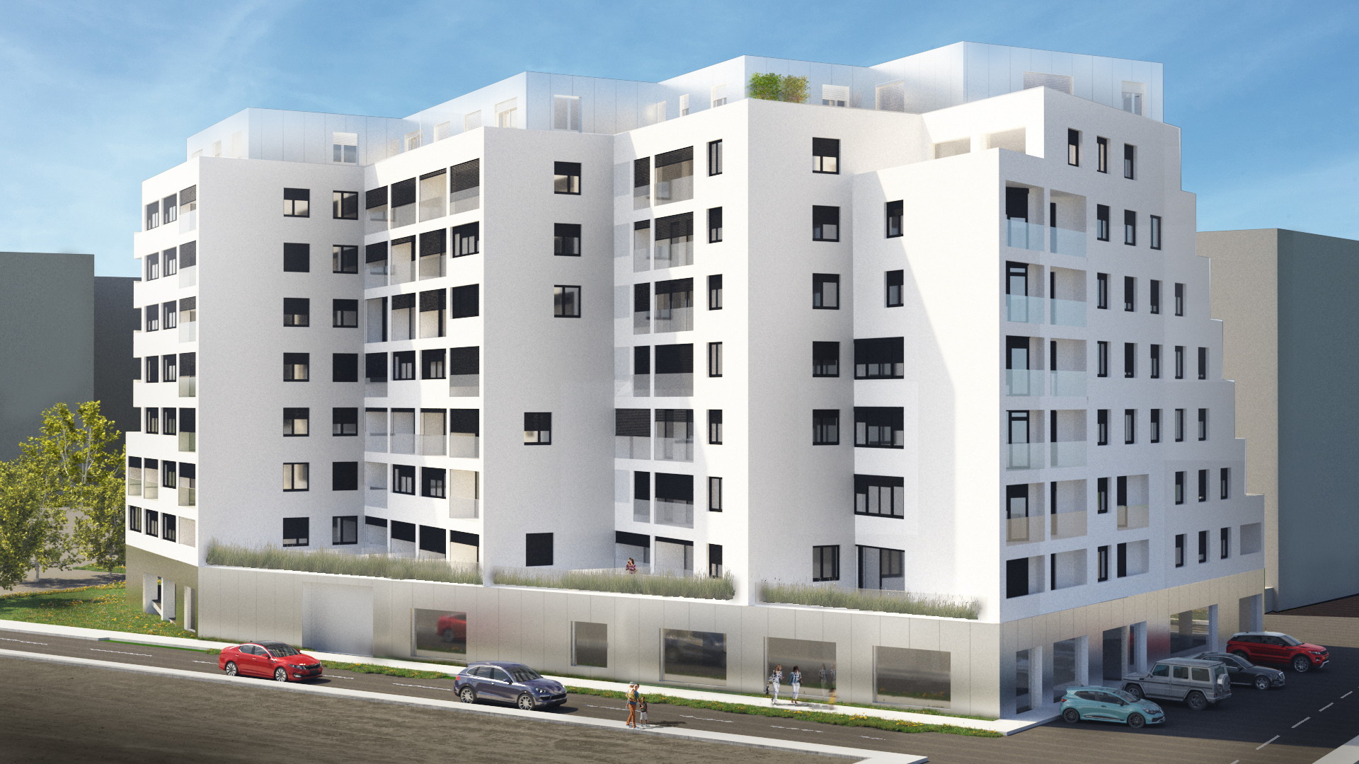 - prizemlje oblikuje kao monolitna betonska baza, izvana obrađena pročeljem s reflektivnim staklom / poliranim limom i perforirana izlozima trgovačkih i poslovnih sadržaja u prizemlju,