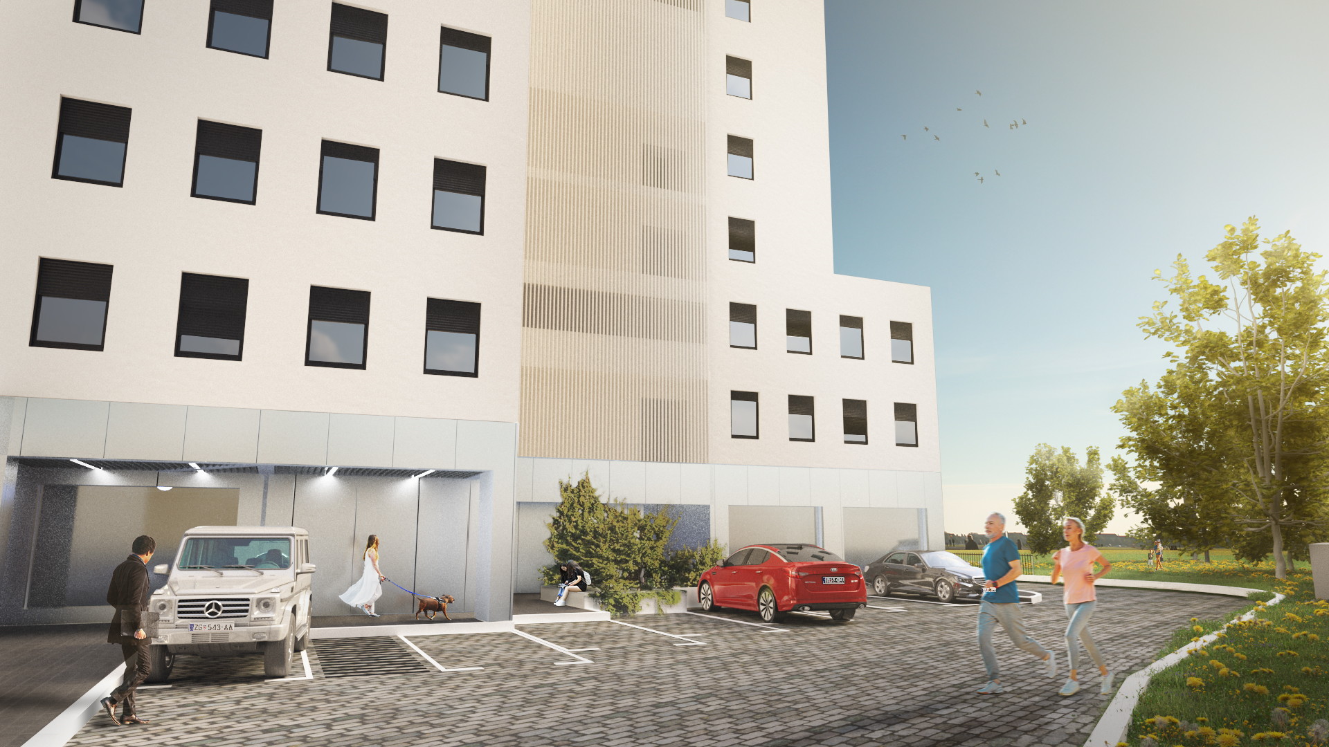 Planirana su dva natkrivena prolaza kroz zgradu u prizemlju (u smjeru istok – zapad, sjever – jug) kroz koje se dolazi do dva glavna ulaza u stambene djelove sa stubišnim jezgrama i dizalima.